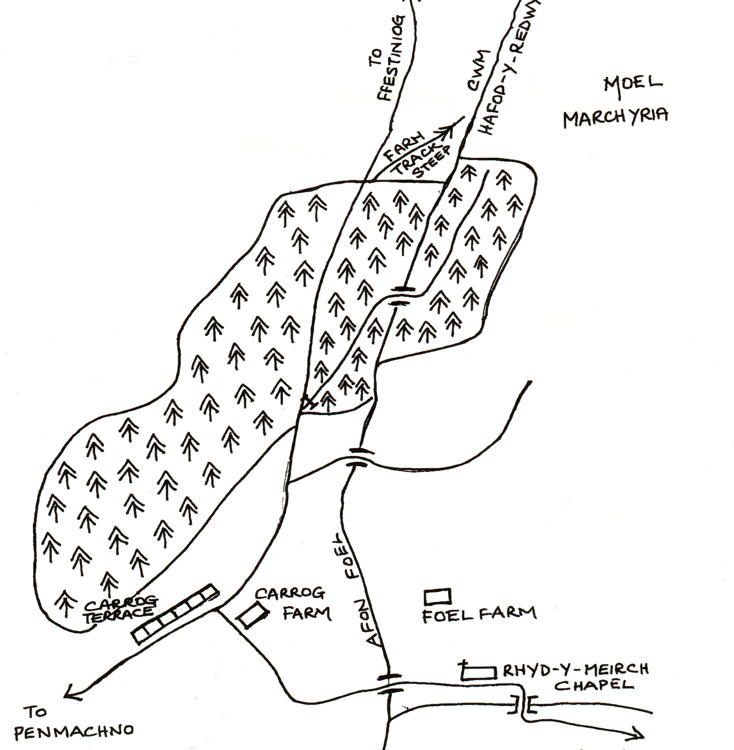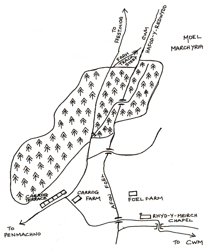 This is a short, doggy walk in the forest beside the road to Ffestiniog. From Carrog Terrace proceed up the hill 'till you reach the trees, and then turn down the forest road towards the stream. Cross the stream and continue to the end of the road. Recent felling has opened up the area, but unfortunately there is no path up the stream. It is possible to scramble across the stream to reach the farmers' track that ascends steeply to the cattle grid at the top of the forest, but 'scramble' is the operative word and so the sensible will return the way they have come. On the way back you could make a short diversion through the farmers' gate on the left just past the trees, to a pleasing little bridge where the Afon Foel can be impressive after rain.