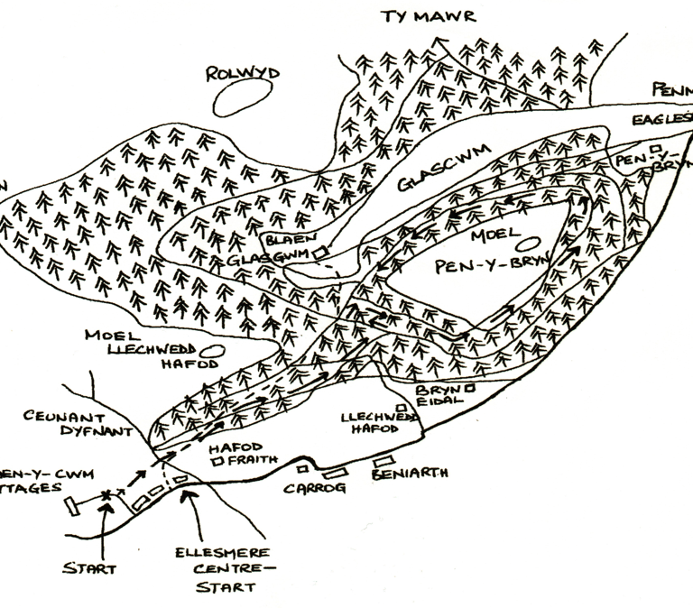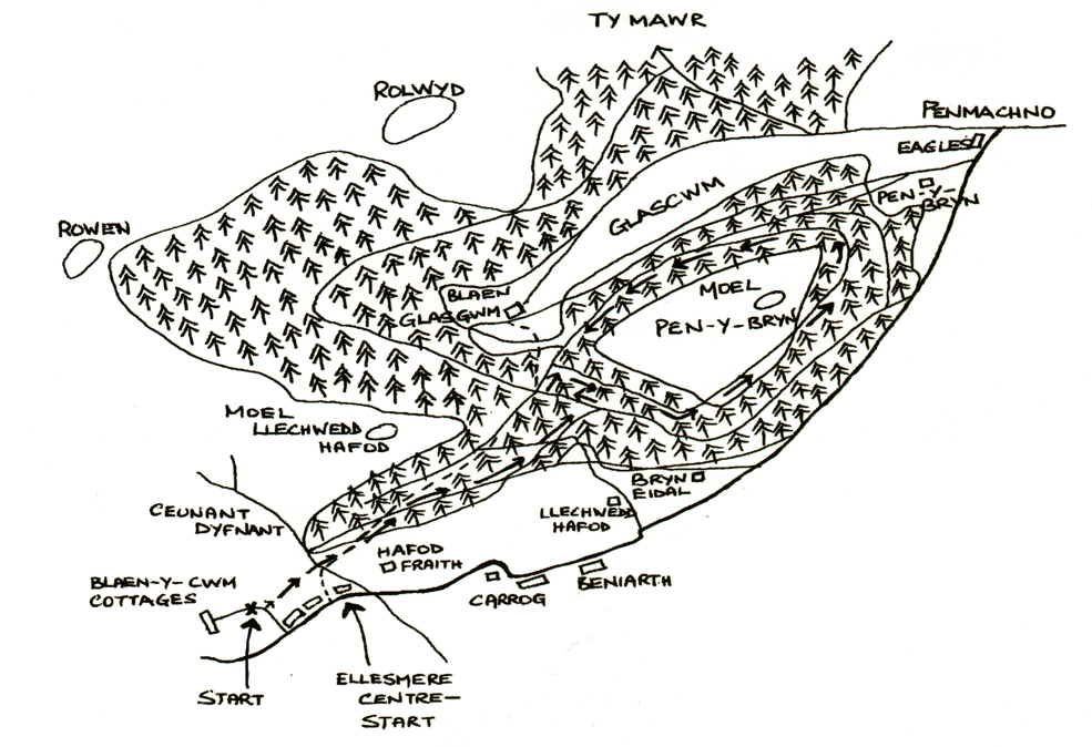 Pen-y-Bryn, the pleasing shape that overlooks Penmachno on the approach from the A5, provides a testing course for rally drivers and an invigorating 6 mile circuit for walkers from Cwm. The walk is highly recommended for any time of the year, especially now that some forest clearance has opened up the views. It is an excellent route for the dog and for a snowy winter excursion, as it is on forest roads nearly all the way. Directions can be fairly brief as it overlaps the previous walk. When you reach the first forest road, do not follow the arrow up the bank, but this time carry straight on along the road. Ignore a grassy turn-off towards Llechwedd Hafod Farm and carry on to a T junction below Pen-y-Bryn. Right leads to the Cwm road or a low circuit of the hill; very sharp left is the way we want for the upper and shorter circuit. Fairly soon you come to a cross-road straight on goes a long way round above Glascwm to Ro Lwyd Hill; left goes back to Cwm, and so we turn right. Notice a yellow arrow pointing left into the trees. This is a continuation of the footpath to Glascwm, but we shall have to go that way another day. Don't miss the next right and you will be all set for the circuit of the hill. You could carry straight on at this point for a clock-wise circuit, but I choose to go the other way round as the main ascent comes first. When you reach the cross-roads again on the way back, you have the choice of retracing your outward route by turning left and sharp right later, or of carrying straight on to find the yellow markers and 'The Way through the Woods' used in the previous walk.