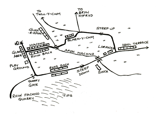 Obviously you may begin this short introductory stroll at any point on the circuit. I shall begin by turning into the lane between Loranka and 1 Ddol Terrace, and walk up the lane to Blaen-y-Cwm Cottages. Nos. 13 Blaen-y-Cwm Cottages go back to the seventeenth century before all the quarrying activity.Tum left to the path in front of the cottage gardens and a sharp left and right brings you down towards the river. Cross the bridge and walk up the road with the Machno Terrace on the right and Rhiw Bach Terrace on the left. Turn left when you reach Glan Aber Terrace, and carry on past the children's swings and the Quarry gate, before descending sharply past Rhos Goch Cottages and Swch Farm to the starting-point.